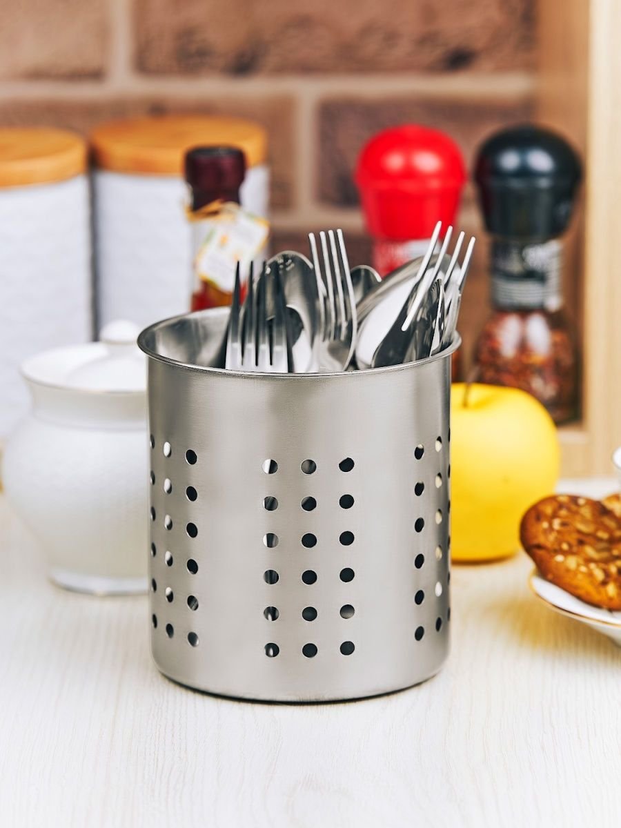 Вместительная подставка сушилка для столовых приборов и других кухонных мелочей позволит организовать пространство на кухне и держать всё необходимое под рукой. Благодаря отверстиям по бокам столовые приборы быстро высыхают. Металлическая подставка проста в использовании и практична.