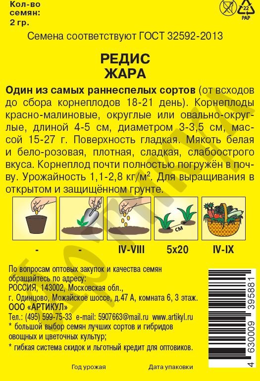 Скороспелый (21–22 дня от всходов до технической спелости) сорт. Корнеплод гладкий, округлый, красно-малиновый, массой 25–30 г. Мякоть белая, плотная, слабоострого вкуса. Вкусовые качества хорошие, содержит много аскорбиновой кислоты. Сорт среднеустойчив к цветушности. Урожайность до 2,3 кг/м2. Посев в грунт производится в конце апреля–начале мая на глубину 1 см по схеме 5–7x15 см, повторно–в июле.