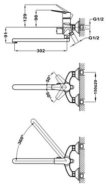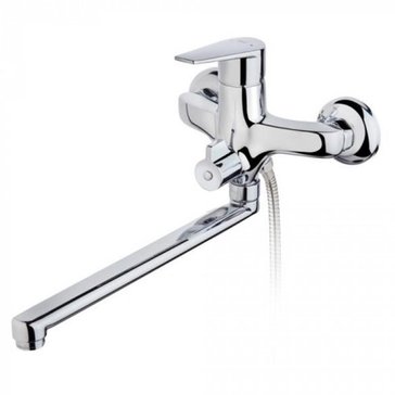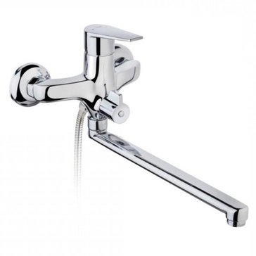 Смеситель универсальный (для умывальника и ванны) • Керамический картридж 35 мм • Поворотный плоский излив 300 мм • Керамический переключатель на душ • Аэратор с защитой от накипи • Противошумовой элемент в эксцентриках • Без душевого набора