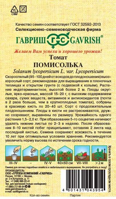 Скороспелый (95-100 дней от всходов до плодоношения) высокорослый сорт, рекомендован для выращивания в пленочных теплицах и открытом грунте (с подвязкой к кольям). Растение индетерминантное, высотой более 2 м. Плоды округлые, ярко-красные, массой 15-20 г, с высоким содержанием сахара, сухих веществ, витаминов и антиоксидантов (почти в 2 раза больше чем в крупноплодных томатах), собраны в красивую кисть по 20-40 шт. Сорт с продолжительным плодоношением. Плоды в кисти не растрескиваются, дружно созревают, выровнены по размеру. Урожайность одного растения 1,5-2,0 кг. Посев на рассаду — в конце марта – начале апреля. Пикировка — в фазе первого настоящего листа. Высадка — в начале — середине мая (если апрель теплый, то высадка рассады возможна в конце апреля). Формируют в один стебель, удаляя все «пасынки». При образовании 5-го соцветия начинают удалять нижние листья по 2-3 в неделю. После образования 8-10 кистей побег прищипывают, оставляя 2 листа над последней кистью. Схема посадки: 40х60 см.