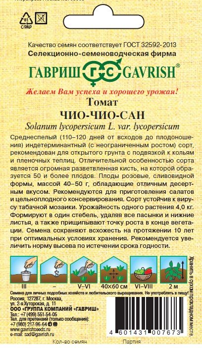 Среднеспелый (110-120 дней от всходов до плодоношения) индетерминантный (с неограниченным ростом) сорт, рекомендован для пленочных теплиц и открытого грунта с подвязкой к кольям. Отличительной особенностью сорта является огромная разветвленная кисть, на которой образуется 50 и более плодов. Плоды розовые, сливовидной формы, массой 30-40 г, обладающие отличным десертным вкусом. Рекомендуются для приготовления салатов и цельноплодного консервирования. Сорт устойчив к вирусу табачной мозаики. Посев на рассаду — в конце марта. Пикировка — в фазе первого настоящего листа. Высадка рассады в теплицы — в конце апреля — начале мая. Обязательна подвязка растений через несколько дней после высадки. Формируют в один стебель, удаляя все «пасынки» и нижние листья, а также прищипывают точку роста в конце вегетации. Урожайность одного растения 4,0 кг. Схема посадки 40х60 см. Плоды собирают по мере созревания. Семена сохраняют всхожесть в течение 10 лет при оптимальных условиях хранения. Рекомендуется увеличить норму высева по истечении срока годности.
