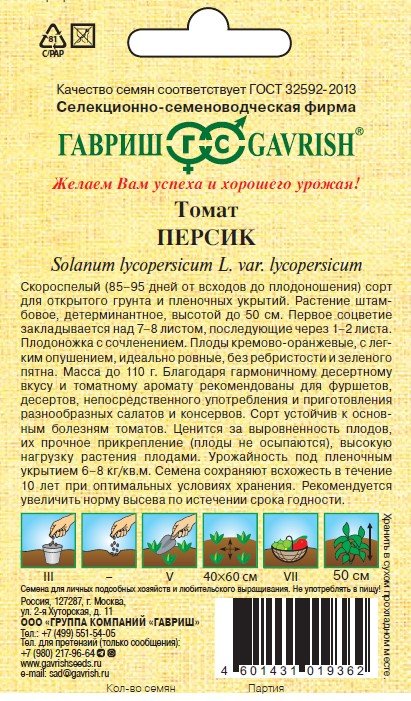 Скороспелый (85-95 дней от всходов до плодоношения) сорт для открытого грунта и пленочных укрытий. Растение штамбовое, детерминантное, высотой до 50 см. Первое соцветие закладывается над 7-8 листом, последующие через 1-2 листа. Плодоножка с сочленением. Плоды кремово-оранжевые, с легким опушением, идеально ровные, без ребристости и зеленого пятна. Масса 100-106 г. Благодаря десертному гармоничному вкусу и томатному аромату рекомендованы для фуршетов, десертов, приготовления разнообразных салатов и консервов. Устойчив к основным болезням томатов. Ценится за выравненность плодов, их прочное прикрепление (плоды не осыпаются), высокую нагрузку растения плодами. Урожайность под пленочными укрытиями 6-8 кг/м2. Посев на рассаду — в марте. Пикировка рассады — в фазе первого настоящего листа. Высадка рассады — в мае. Схема посадки: 40х60 см.