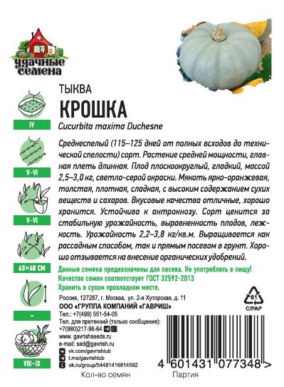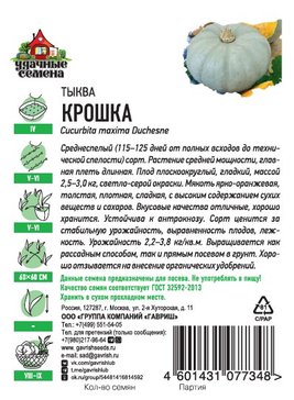 Среднеспелый (115-125 дней от полных всходов до технической спелости) сорт. Растение средней мощности, главная плеть длинная. Плод плоскоокруглый, гладкий, массой 2,5-3,0 кг, светло-серой окраски. Мякоть ярко-оранжевая, толстая, плотная, сладкая, с высоким содержанием сухих веществ и сахаров. Вкусовые качества отличные, хорошо хранится. Устойчива к антракнозу. Сорт ценится за стабильную урожайность, выравненность плодов, лежкость. Урожайность 2,2-3,8 кг/м2. Выращивается как рассадным способом, так и прямым посевом в грунт. Хорошо отзывается на внесение органических удобрений
