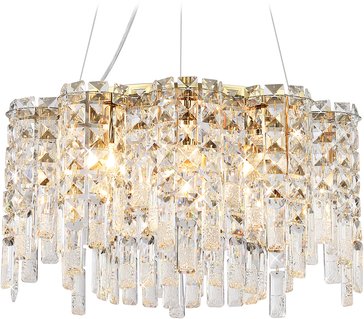 Подвесная люстра с хрусталем из коллекции TRADITIONAL TR5465 представлена в стиле неоклассика и оснащена десятью цоколями Е14. Светильник выполнен из металлического основания золотого цвета, прочных тросов, хрустальных плафонов и будет прекрасным дополнением в любом помещении.